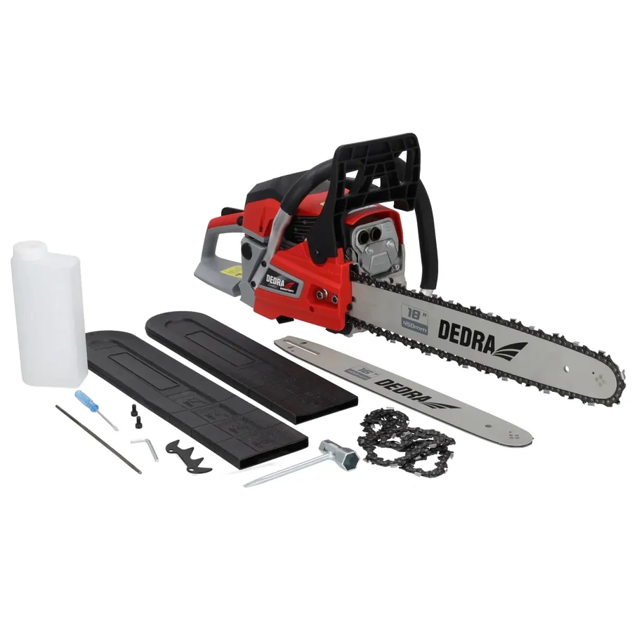 A DEDRA DED8718P2 benzinmotoros láncfűrész egy masszív és hatékony eszköz, amely kiválóan teljesít mind professzionális felhasználásra, mind háztartási munkákhoz.